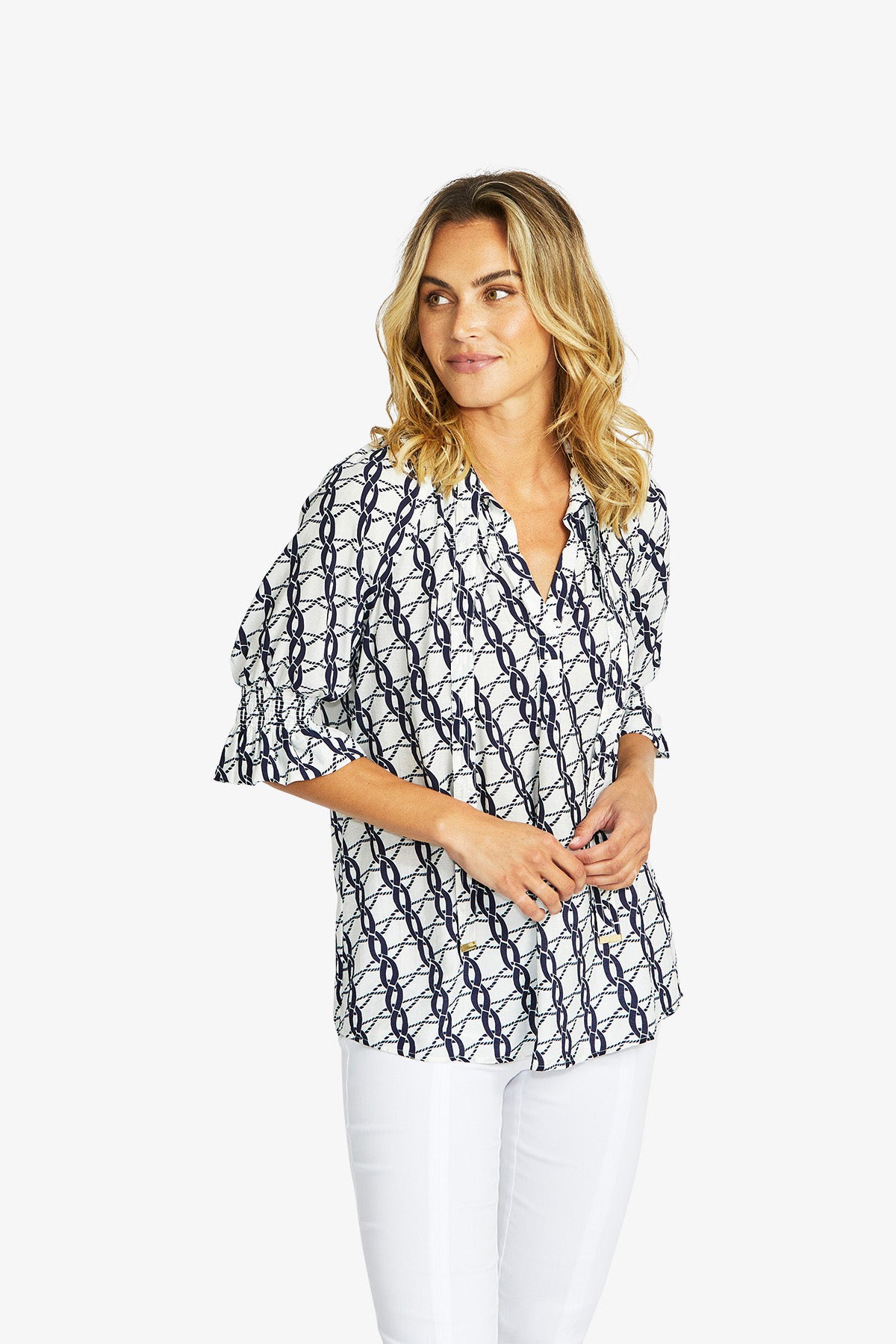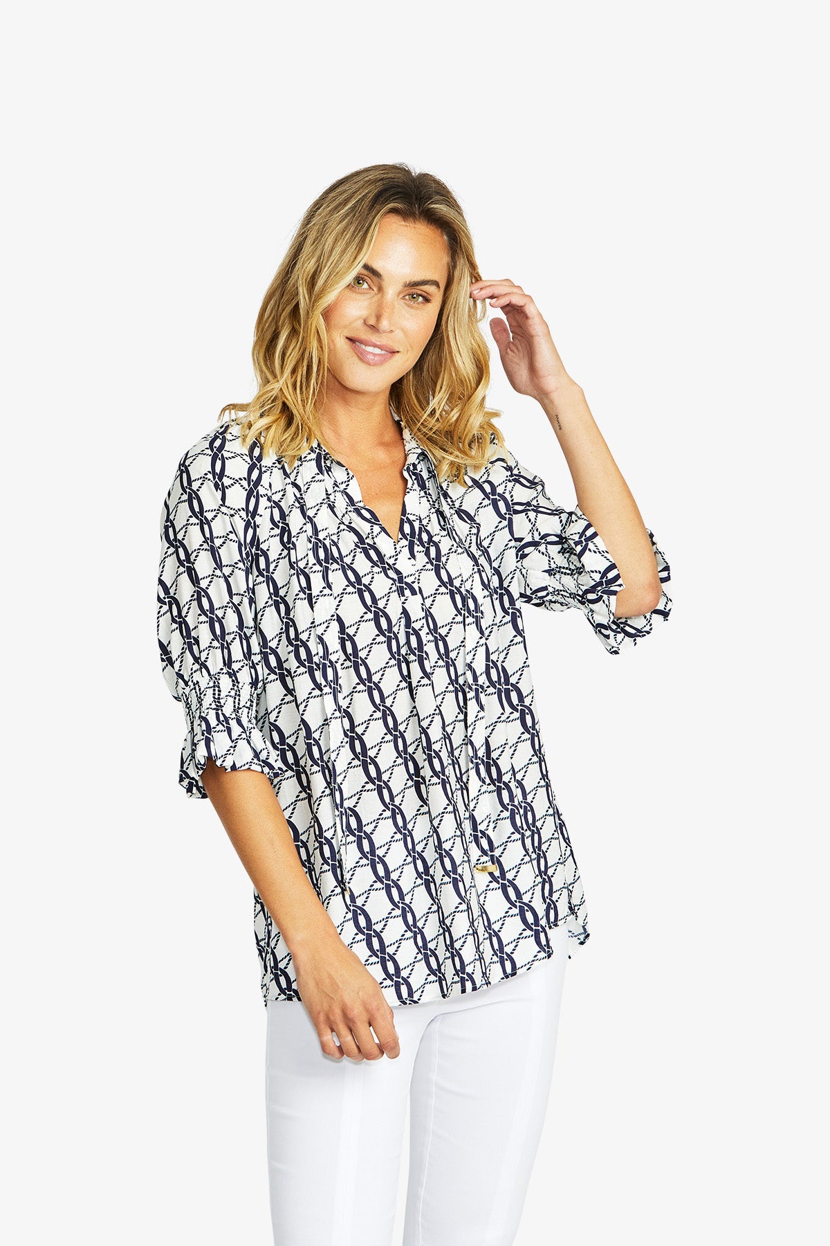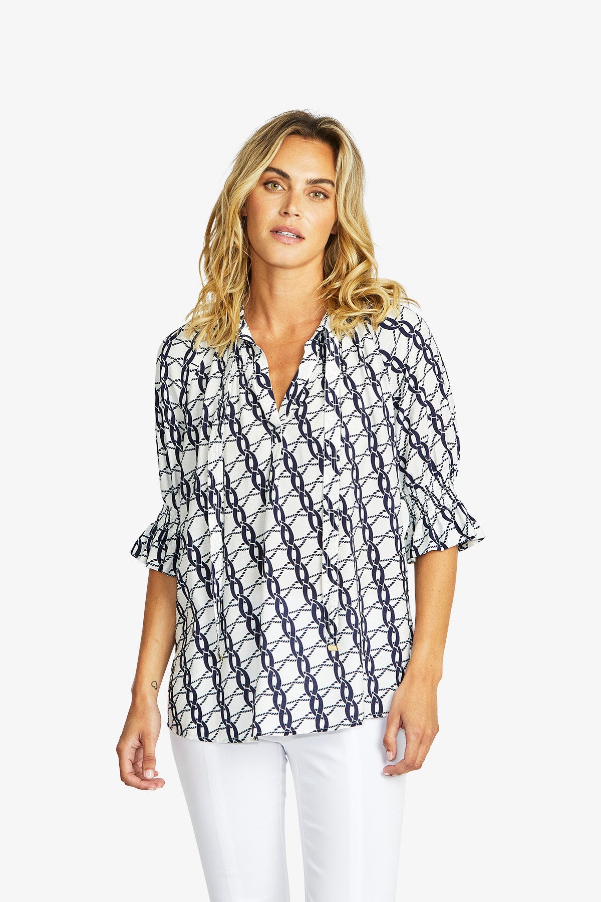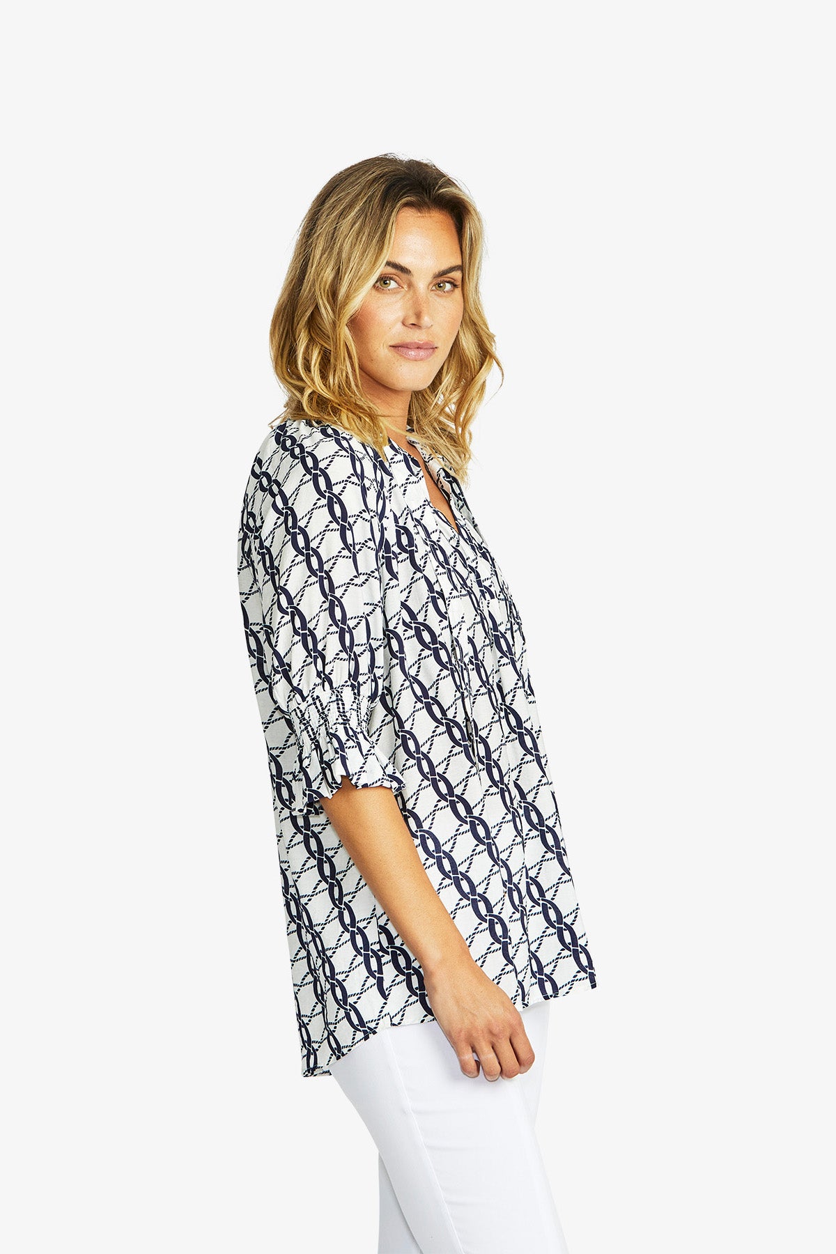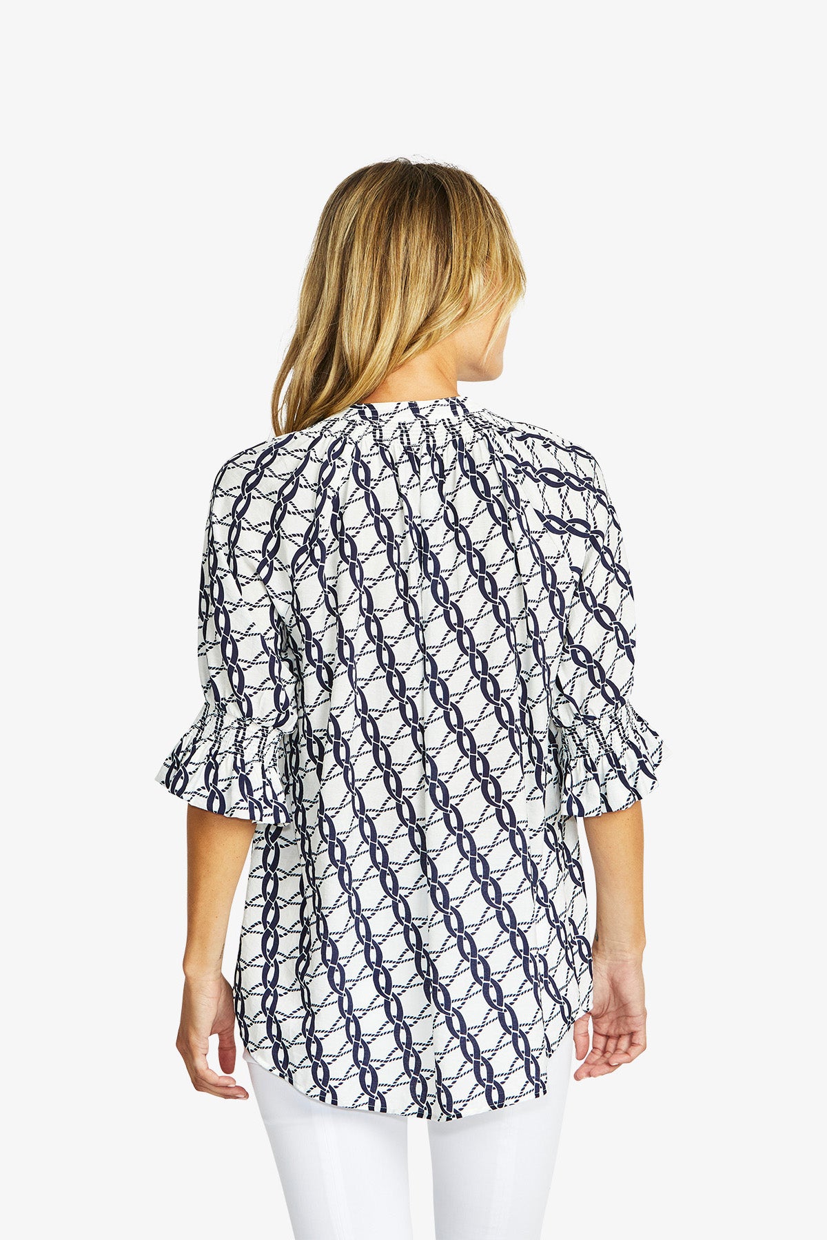Elevate your style with the chic Chain Tunic Blouse, featuring an eye-catching chain pattern print in classic navy and white.