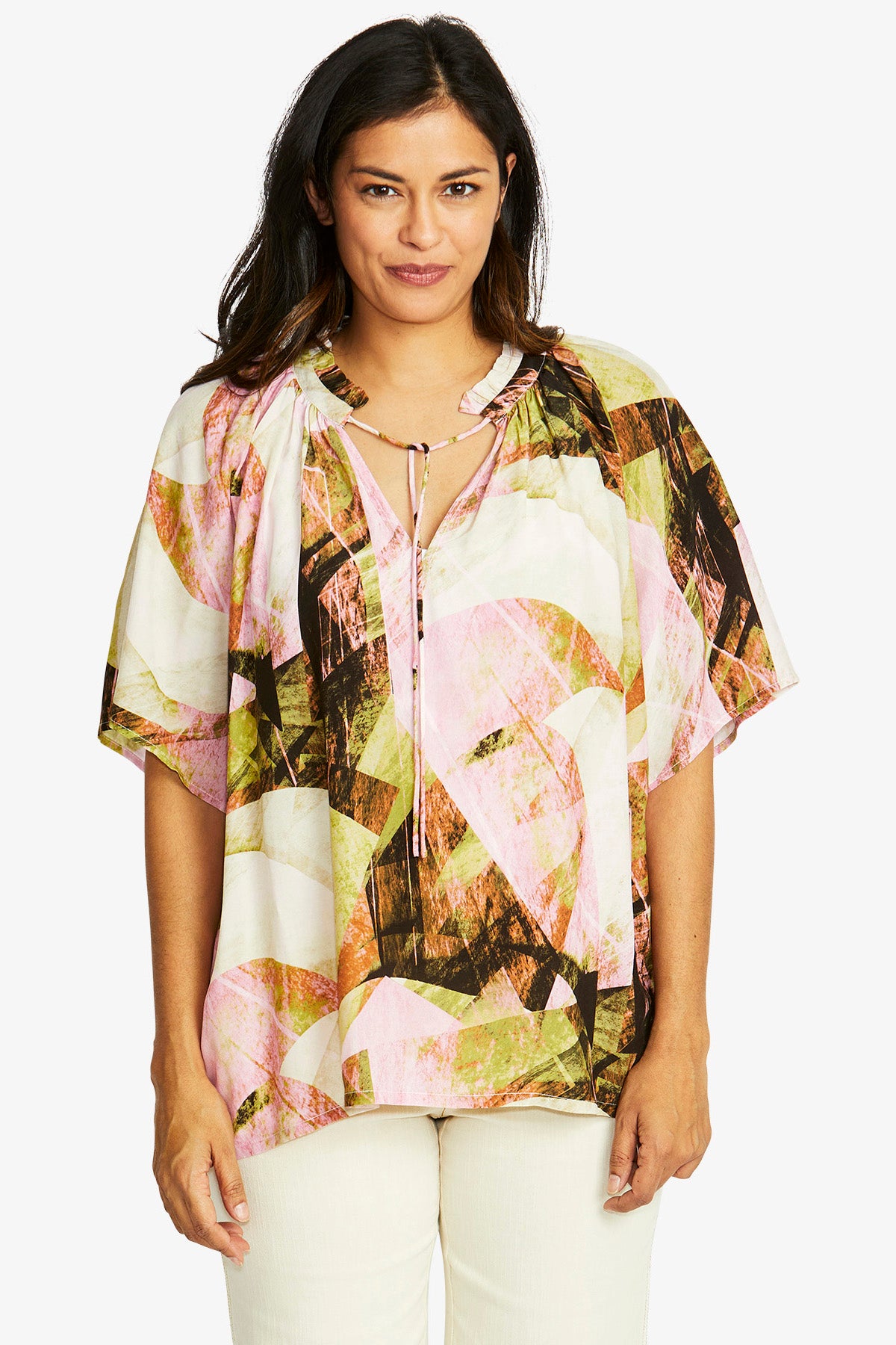 The Dreamer Top is a stylish and flowy piece designed for effortless elegance. Featuring a bold abstract print, this top includes flutter sleeves and a gathered neckline with tie detail, creating a soft feminine look.